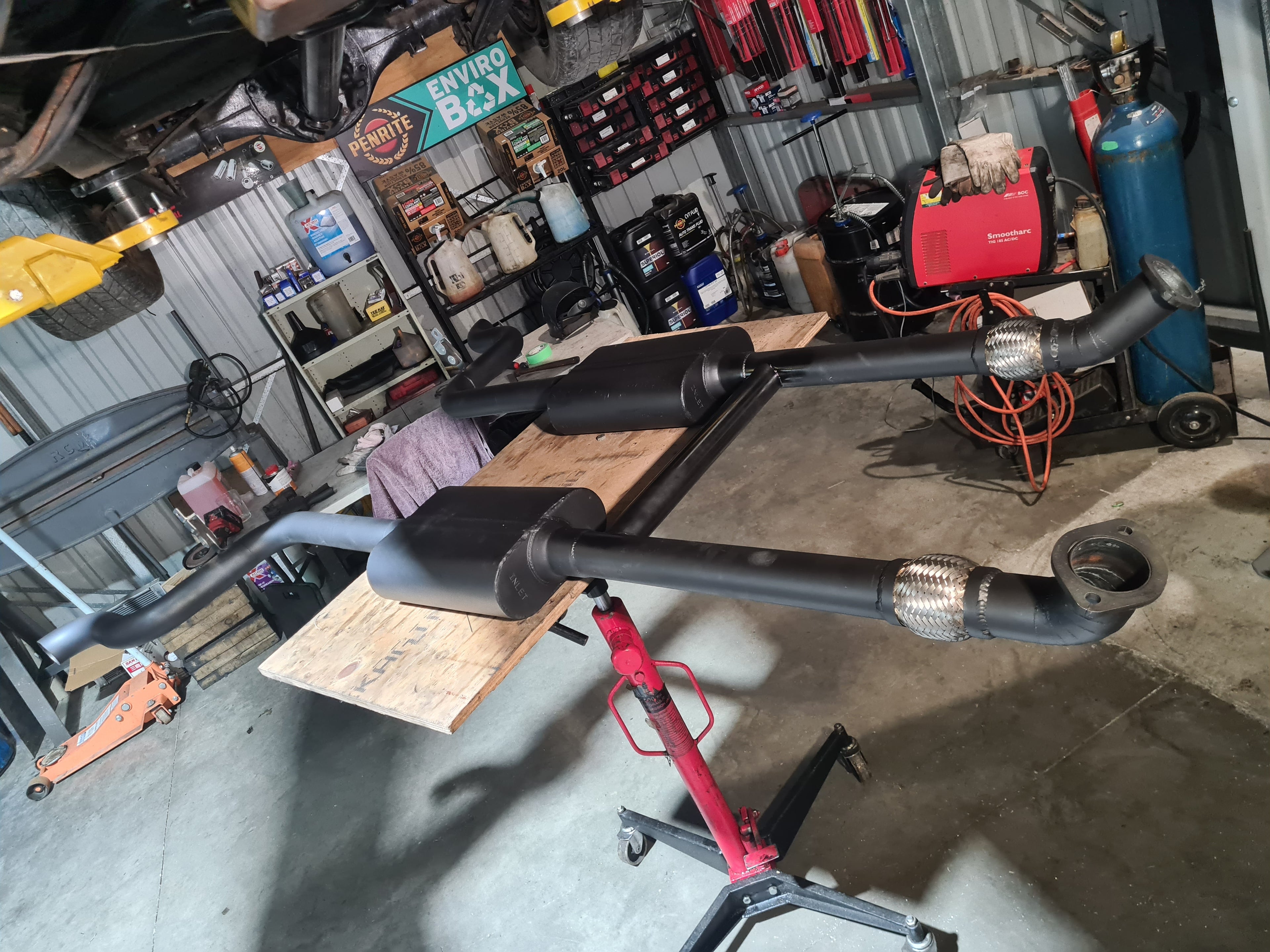 Custom mild steel exhaust system fabricated for a V8 Vauxhall, designed for strength, sound, and performance.