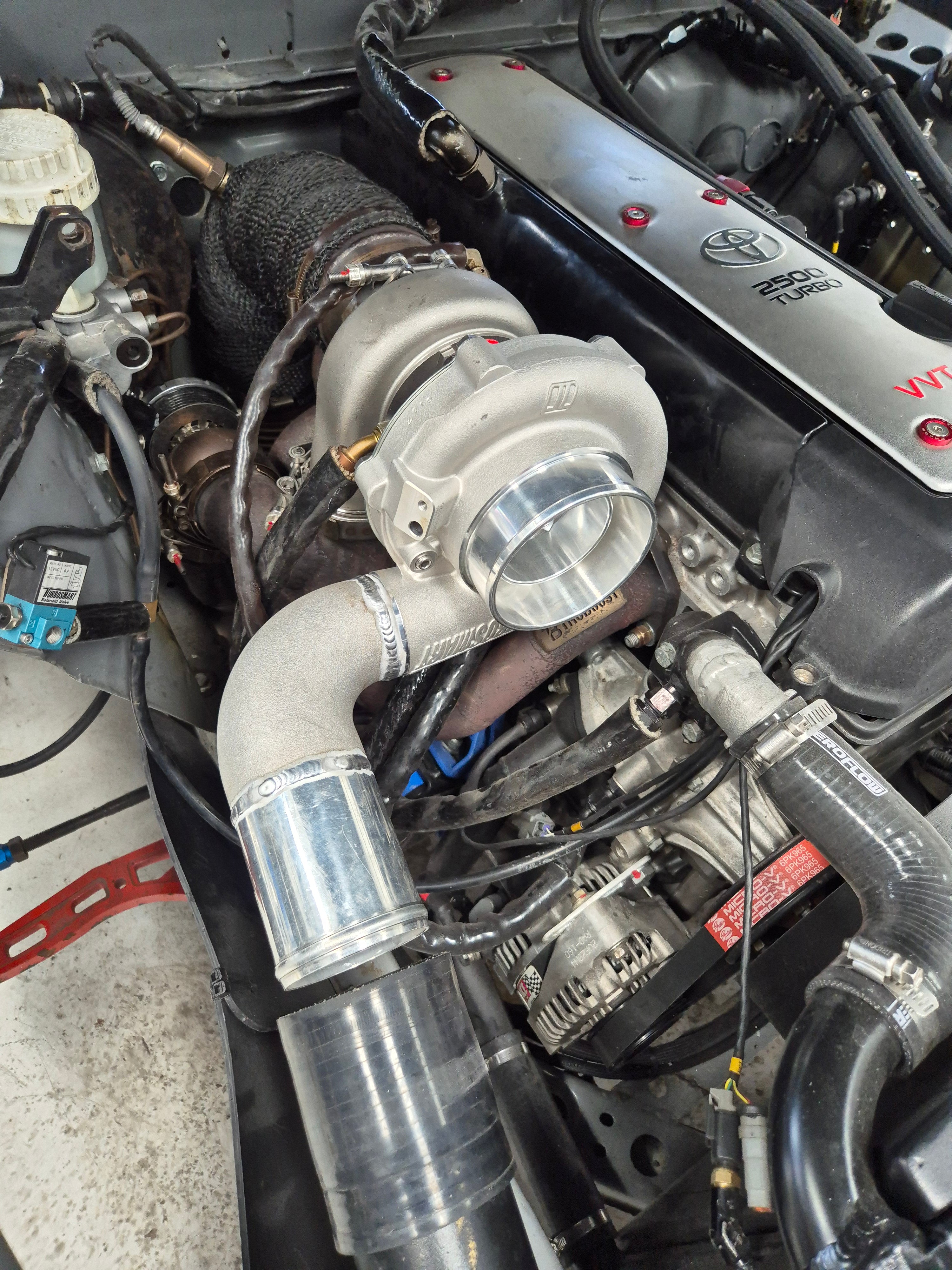 Turbosmart turbo installed on a 2JZ drift car with a custom compressor outlet designed for a perfect fit and optimal boost response.